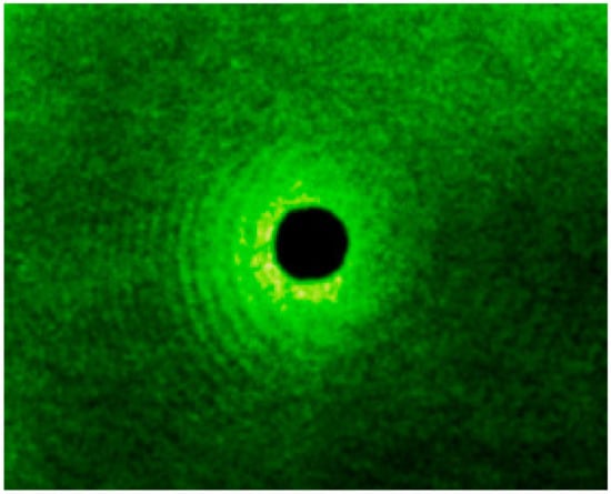 Under the irradiation of water with laser pulses with a certain intensity at the wavelength of 1064 nm, instantaneous diffraction patterns appeared on the luminescence screen. We used a mask cutting the central radiation maxima for the first and second harmonics (Figure 7) to prevent direct light incidence on the CCD array of the camera, which was used for snap-shooting the patterns on the screen. The size of the object, resulting in the diffraction, was estimated by the period of diffraction rings; this size was about 1–5 μm. Thus, it was found that the laser shooting of water results in the formation of objects of such sizes. These objects instantly disappear if water is under normal conditions. If water was maintained at a temperature slightly less than the boiling point, we observed the formation of vapor bubbles under the same experimental conditions; i.e., liquid boiled before reaching the boiling point. Thus, we claim that the objects at which the second harmonic beam is diffracted are vapor–gas bubbles. In this experiment, it is important that the coalescence regime arose at intensities of the order of 106–107 W·cm−2, which is close to the estimate in Appendix A. A macroscopic vapor–gas bubble (which is a negative lens with respect to laser radiation) is formed at the laser pulse front. To initiate an optical breakdown inside such a bubble, laser radiation should be introduced into such a bubble, which obviously requires a higher laser pulse energy compared to the energy applied to generate this bubble. It is clear that, at the energy of threshold of stimulated optical coalescence, the laser beam cannot penetrate into the bubble, and no optical breakdown spark (plasma flash) occurs.