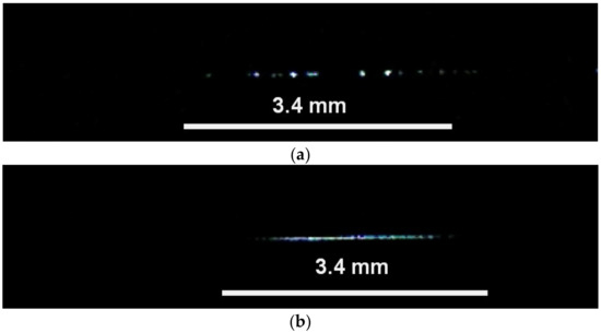 It should be noted that, after the completion of the picosecond laser pulse, the glow of the breakdown plasma is controlled by radiative processes, the duration of which can exceed the duration of the laser pulse, see [13,47]. All this leads to the initial breakdown pattern, consisting of individual plasma flashes (Figure 9a), turning into a “smeared” breakdown pattern shown in Figure 9b. The blurring process is due to the plasma expansion and the effect of moving the breakdown site, see Ref. [13].