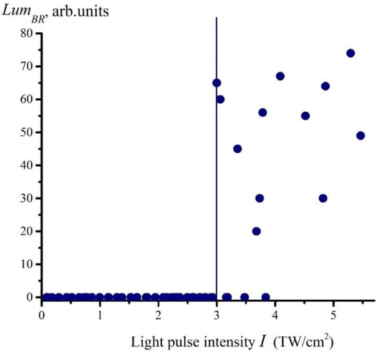 As shown in Appendix A, at the laser pulse intensity of about 107 W/cm2, stimulated optical coalescence occurs at times of the order of 10−10 s. However, with increasing intensity, all dynamic processes leading to the stimulated optical coalescence of the bubston cluster are significantly accelerated. Therefore, at intensities of the order of 1012 W/cm2, the stimulated optical coalescence should be completed within times less than 20 picoseconds, and in this case a plasma flash of optical breakdown occurs. In experiments with high-intensity picosecond pulses, the threshold intensities Ithr for the occurrence of optical breakdown flash in degassed water and water, saturated with dissolved gas, were studied. Degassing was carried out by the prolonged boiling of the liquid under vacuum; the degassing technique is described in detail in a recent paper [46]. A highly sensitive receiver (photoelectron multiplier FEU-79, LLC Zapadpribor, Moscow, Russia, not shown in Figure 4) made it possible to fix the plasma emission of optical breakdown LumBR at I ≈ Ithr. In Figure 10, we exhibit the dependence of LumBR vs. the laser pump intensity in the focal area of a short-focus lens (F = 20 mm) for degassed Milli-Q water. The threshold value of the breakdown intensity for such water was Ithr = 3.0 TW/cm2, and this value remained unchanged in time providing that the liquid sample was kept in a hermetically sealed cell (i.e., without access of atmospheric air).