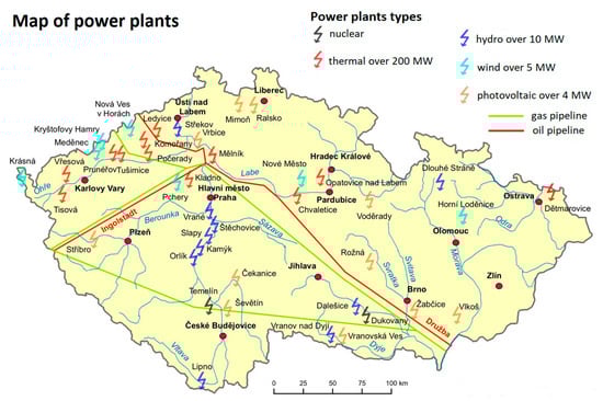 The Czech Republic must implement a number of measures as a result of its membership to the European Union and is required to follow the provided common European energy policy. The EU committed, at the entry time of the Czech Republic, to increasing the share of renewable energy sources in final consumption to 20% by 2020 [6]. This aim was cut to 13% for the Czech Republic. Another significant reason to adopt RES is to reduce environmental damage, such as a drop in biodiversity and a decline in agricultural production. Another negative impact of solid fuel combustion is the influence on human health, which is a significant concern in the western part of the country [6]. Other reasons for supporting RES include, for example, the reduction of climate change, which is helped by a significant reduction in greenhouse gas emissions that are not produced through RES [6]. A basic overview of large power plants in the territory of the Czech Republic is shown in Figure 1, that is based on [7].