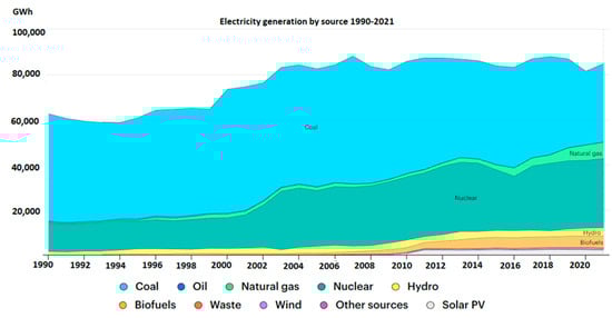 Some energy production methods are more ecologically friendly than others. Nowadays, one of the most effective methods for producing electrical energy from nonrenewable resources is still used [16]. However, despite their energy efficiency, they conceal a number of hazards. When coal, coke, and other fossil fuels are burnt, a considerable volume of exhaust gases escape into the atmosphere, polluting the environment and posing a significant risk to human health [17]. For the Czech Republic, an overall review of energy sources used is shown in Figure 2, based on [18].
