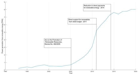 The main purpose of Law No. 165/2012 is to define rights and responsibilities while dealing with energy and energy resources. It enacts a number of steps to increase energy efficiency and management. As part of these activities, it developed the State Energy Concept, territorial energy concepts, and the State Program to stimulate energy conservation and the use of renewable energy sources. It also specifies the minimum energy efficiency for energy production and requires larger energy consumers to do an energy audit [10]. It also governs the financing of support, which is used to cover the costs of generating electricity, heat, and biomethane from supported sources, non-central electricity production, and the provision of subsidies to market operators for the payment of these costs and the deduction of electricity from solar installations. One of the goals of this law is to encourage the use of renewable energy sources, secondary sources, and high-efficiency combined production plants of electricity, heat, biomethane, and decentralized electricity within the context of environmental and climate protection, to ensure an increase in the share of renewable energy sources in the consumption of primary energy sources, to contribute to the careful use of leading sources, and to contribute to the creation of conditions conducive to the use of leading sources. The quantity of assistance varies depending on the nature and size of the source, and in the case of biomass, the quality of the fuel. This regulation is also administered by the Energy Regulatory Office, which publishes yearly minimum purchase prices for renewable energy [19]. A basic overview of renewable power generation in Czech Republic is shown in Figure 3. There is also a basic overview of regulatory milestones that mostly affected renewable generation in Czech Republic, based on [20,21].