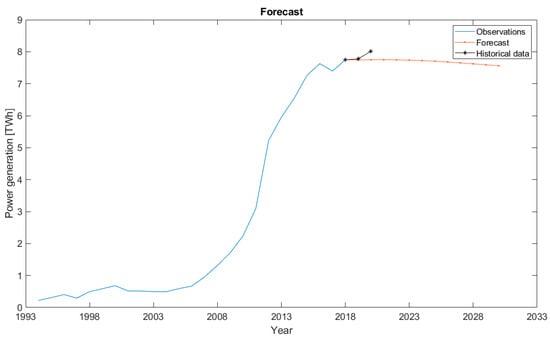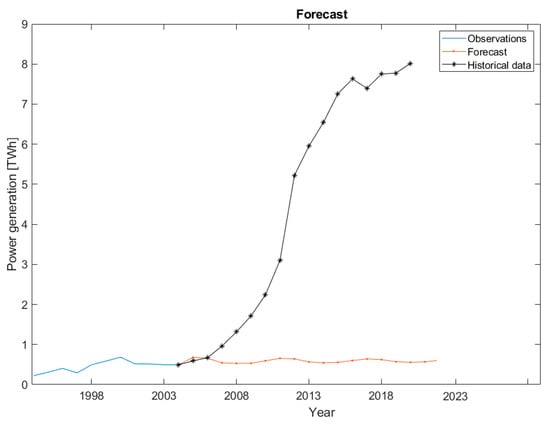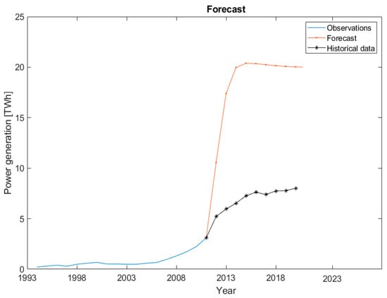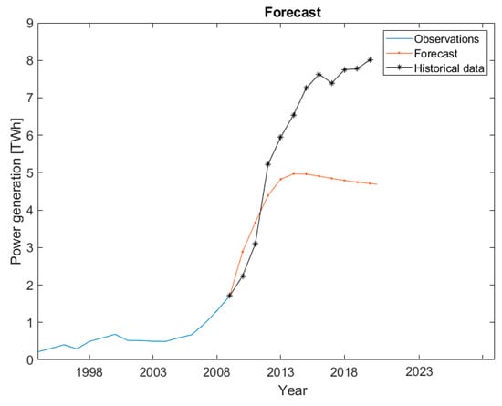 The third model, in Figure 9, used data up to 2012 for training the network, when the number of installations producing energy from RES increased dramatically. If this trend were to continue, it would theoretically be possible to expect further growth in production, reaching a peak in 2018 at the level of 20 TWh. Here, however, it should be noted that this amount of energy is, perhaps, beyond the level of the country’s capabilities.