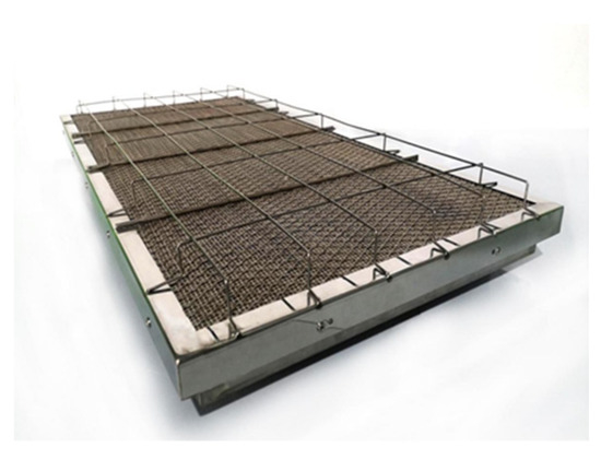 A catalytic infrared equipment setup was constructed, including a catalytic infrared radiator system, a gas supply system, an electric control system, a temperature measurement system, and the main body of the equipment, as displayed in Figure 2. The radiation plate (800 × 400 × 50 mm) used in the experiment is shown in Figure 3, and its maximum power was 4 kW. Two catalytic infrared radiation panels were located on top of the equipment. The bottom platform was insulated and equipped with a base frame to prevent heat transfer between the coating sample and the platform. A control cabinet was used to adjust the distance between the radiation panels and the sample. During the curing process, the samples’ temperatures and the air inside the equipment were measured using K-type thermocouples. We set one temperature measurement point centered at the top of the samples and one centered at the bottom. The temperature signals were transmitted to a computer. A portable infrared thermometer was used to measure the temperature at the panel’s surface in real time. The gas used in this experiment was liquefied petroleum gas (LPG) from a tank. The details of the experimental instruments are shown in Table 1.