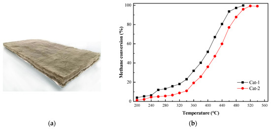 Figure 4. (a) Fiber-supported noble metal catalyst. (b) Methane conversion versus temperature with the Cat-1 and Cat-2 catalysts.