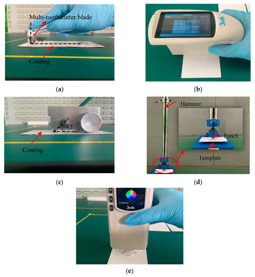 Figure 5. Test equipment and processes: (a) adhesion test, (b) gloss test, (c) hardness test, (d) film impact resistance test, and (e) color test.