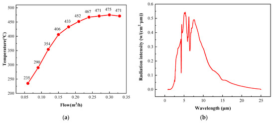 Figure 6. (a) Relationship between the surface temperature of the radiant panel and the gas intake. (b) The catalytic infrared radiation intensity of the radiant panel.