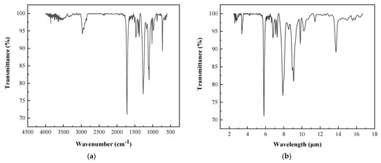 Figure 7. The infrared spectra of the polyester-based/TGIC powder coating: (a) variation with wavenumber and (b) variation with wavelength.