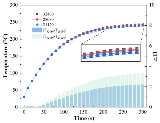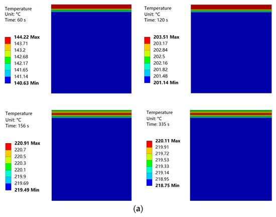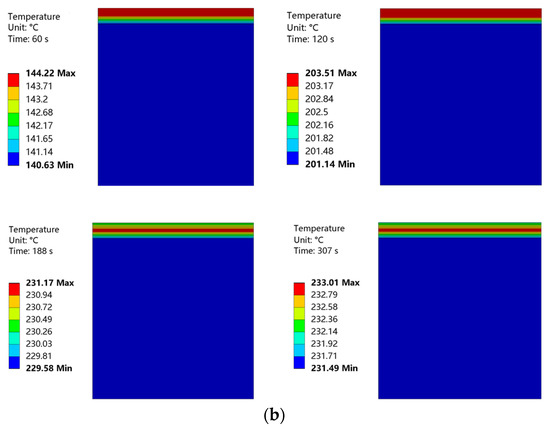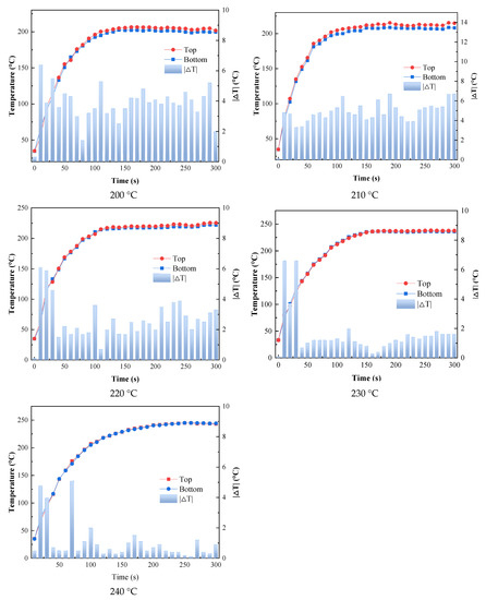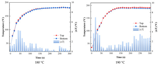 As shown in Figure 8, within 1 min of the beginning of heating, the top and bottom of the substrate had a significant slope and the temperature rose rapidly, indicating that the catalytic infrared radiation could heat the coating and the substrate rapidly. In addition, the maximum temperature difference between the top and bottom of the substrate did not exceed 7 °C during the curing process, which indicated that the temperatures of the substrate and the coating remained almost consistent during the curing process, which was conducive to the bonding of the coating and the substrate.