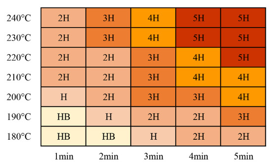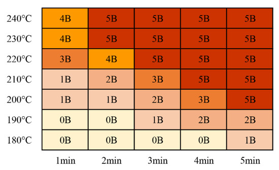The adhesion results for the cured products after curing with catalytic infrared radiation are shown in Figure 9. A rating higher than 4B is generally considered a qualified product [14], and the rating standards are shown in Table 4. With increasing curing temperature and curing time, the adhesion level of the coating increased. This was due to the enhanced degree of bonding between the coating and the substrate. When the curing temperature was 200 °C and the curing time was 5 min, an adhesion rating of 5B was obtained, meeting engineering requirements. With a curing temperature of 230 °C or 240 °C, a curing time of only 2 min was required to achieve an adhesion rating of 5B. Jong Won Choi et al. [14] used NIR radiation to cure a solvent-blended acrylic resin with an amine crosslinker coating, which did not meet the 4B standard. However, they combined an NIR curing system with a convective oven to obtain a coating that met this standard. The maximum allowable temperature for solvent-based coatings is generally low, and the high-power density of an infrared heater may induce thermal stress between the substrate and the coating, resulting in defects, such as local cracks and film deletion.