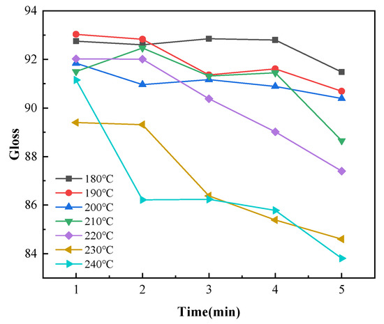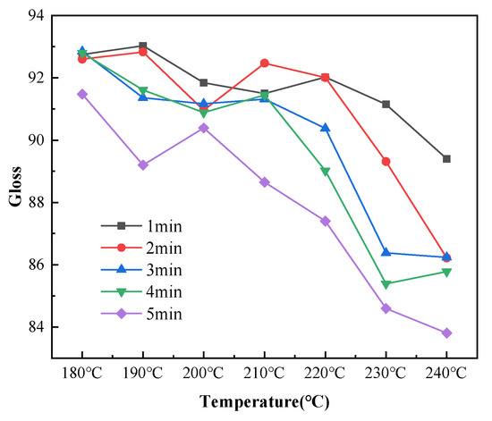 Gloss is an optical property that indicates how the surface reflects light in a specular (mirror-like) direction [33]. The gloss of a colored powder system depends on the degree of dispersion and particle size distribution of the pigments, and gloss has little effect on the infrared absorptivity of coatings [34]. However, gloss affects the appearance of coatings. Therefore, the average gloss values for ten points on each sample were measured for analysis. The coating gloss decreased with increasing temperature for each curing time, as shown in Figure 10. The coating gloss significantly declined at curing temperatures higher than 220 °C. As shown in Figure 11, the curing time slightly affected the gloss at temperatures below 210 °C. The gloss values achieved at these low curing temperatures were within the gloss range required for the coatings (90 ± 5). When the temperature exceeded 210 °C, the gloss sharply decreased with increasing curing time. When the curing time was 5 min and the curing temperature was 240 °C, the average gloss of the coatings decreased to below 85. This demonstrated the importance of controlling the temperature of the coating during curing.