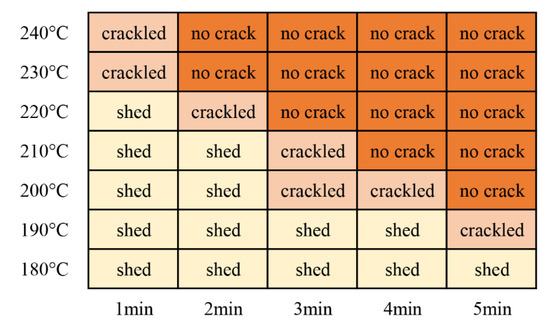 The coating temperature was not maintained at a constant value when it was controlled; it fluctuated up and down. Moreover, there was an unavoidable error in the thermocouple. In addition, there were operational and instrumental errors in the subsequent coating test. Therefore, 220 ± 5 °C for 3 min and 230 ± 5 °C for 2 min can be considered as the optimal curing parameters for the production process.