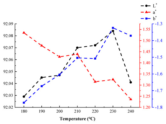 Figure 14. The effects of temperature on the coatings’ CIE laboratory color model values.