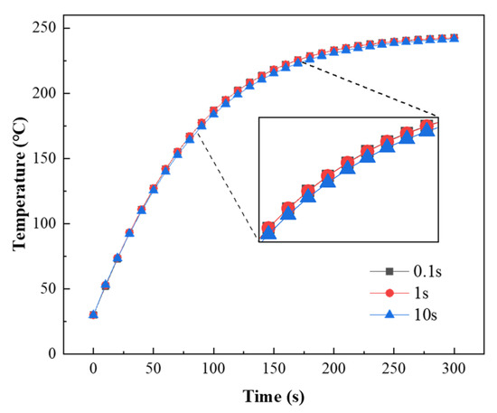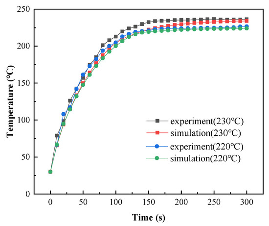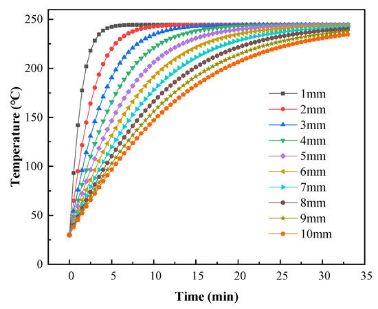 To further analyze the heat transfer during the curing process and to provide a reference for production, numerical simulations were used to predict the coating temperature with different substrate thicknesses. The effects of metal substrate thicknesses ranging from 1 mm to 10 mm on the coating temperature were calculated using a gas inlet flow of 0.2 m3/h. As shown in Figure 22, the rate at which the coatings were heated decreased with increasing substrate thickness. Figure 23 shows the predicted times required for the coating temperature to reach 220 °C or 230 °C with different substrate thicknesses. When the substrate thickness was 1 mm, the coating required 2.58 min to reach 220 °C and 3.12 min to reach 230 °C. The minimum times required to cure the coatings with this catalytic infrared heating equipment were 5.58 min and 5.12 min for curing temperatures of 220 °C and 230 °C, respectively. Moreover, a shorter total curing time was required with a curing temperature of 230 °C, resulting in energy savings. Therefore, it is recommended that a curing temperature of 230 °C should be used when the substrate thickness is 1 mm, and 220 °C should be used when the substrate thickness is ≥2 mm.
