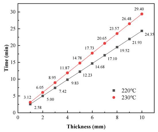 Figure 23. Heating times required for the coating temperature to reach 220 °C and 230 °C with different substrate thicknesses.