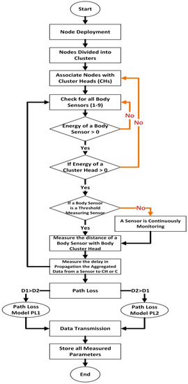 In the proposed system’s initialization phase, the deployed nodes on various body positions are divided into two clusters, and nodes are connected with cluster heads. In Figure 1, various conditions are checked. The space between the body sensor and CH is measured. Check path loss if D1 > D2, then follow PL1; else, if D2 > D1, then follow PL2, transmit the data, and store all measured parameters.