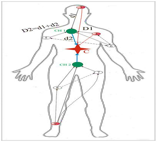 For continuous monitoring of the human body, nodes 3, 4, and 9 have been placed at a distance where continuous monitoring becomes feasible. Other sensor nodes are called action-oriented from the perspective of sensors. In case of an emergency, the three sensor nodes for constant monitoring are embedded with capabilities to communicate directly with the C node to transfer the data directly. The remaining action drive nodes can transmit the data to the C node via other CHs functioning as forwarding nodes, as shown in Figure 2.
