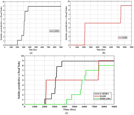 Figure 7. The routing protocol EEDLABA stability period. (a) stability period; (b) stability period; (c) stability period.