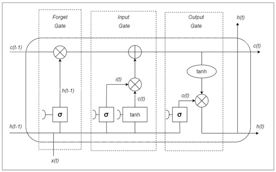 The mathematical model of an LSTM cell can be presented in the following Equations (2)–(7).