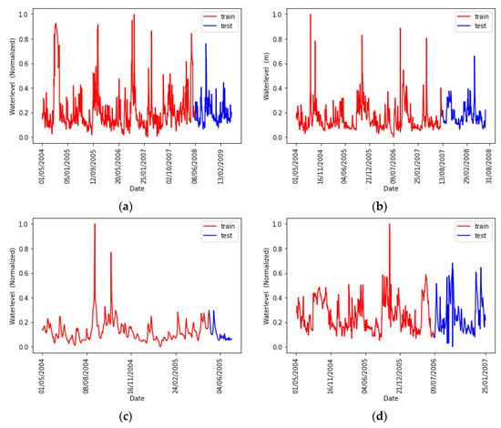 Train–Test data split of (a) Kimbulawala, (b) Kotte Canal, (c) Kotte North, and (d) Parliament Lake.