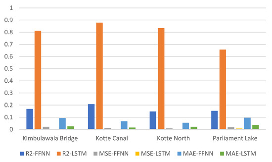 The R2 Score, MSE, and MAE were measured for both FFNN and LSTM network-based models for each wetland water level prediction, and the results are presented in Table 4. The results confirmed that the LSTM had performed better than FFNN in predicting the water levels of the wetlands in all three performance indices considered for the comparison.