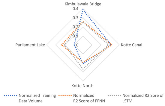As per the graphical illustration of Figure 6, both FFNN and LSTM prediction models followed a similar pattern (only the shape of variation but not performance values) in the normalized performance. Hence, it confirmed both NNs endeavored to discover the hidden relationships (i.e., two types of relationships) for water level prediction. Moreover, although two kinds of relationships considered for the study (i.e., temporal and traditional) have provided a different level of performance, both have a similar degree of information within all wetland data. Therefore, both NNs extracted two types of relationship information from each wetland data in an almost similar ratio. This is confirmed by having normalized performance patterns with the same shape. However, as per Figure 5, it could not find a strong relationship between the amount of training data and prediction accuracy between wetlands. Hence, it confirmed the degree of relationship information embedded in the given wetland data is much more important than the available volume of data for accurate water level prediction.