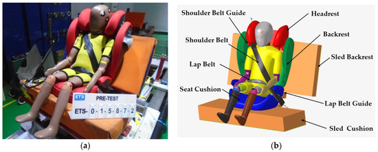 According to ECE R129 regulations, this paper establishes a sled model consisting of a sled cushion, sled cushion fixing plate, ISOFIX fixing rod and seat belt anchorage point. A branded child booster seat has been selected as the research object, which is restrained by the three-point seat belt. The seat belt includes three parts: shoulder belt, lap belt and reel retractor. The Q series 6-year-old child dummy with excellent biological fidelity and injury assessment capability is selected for the sled test [25]. To eliminate the gaps between the dummy and the booster seat, and between the dummy and the seat belt, the three-point seat belt was adjusted till its tension stayed within 50 ± 5 N and the child dummy and the booster seat are both well restrained. The final setup of a child booster seat during the frontal sled test is shown in Figure 1a.