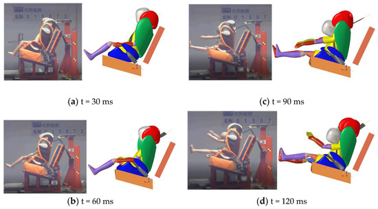 Comparison of child dummy kinematics between simulation and test: (a) t = 30 ms; (b) t = 60 ms; (c) t = 90 ms; (d) t = 120 ms.