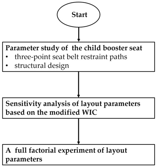 The main purpose of this manuscript is to propose a design framework for the layout parameters of a child booster seat. First, evaluation of each layout parameter is conducted and their impacts on the child injury indices are ranked based on the sensitivity study. Then, two top influential parameters of backrest stiffness and shoulder belt guide position are chosen as the design parameters of the child booster seat. Lastly, a full factorial experiment is performed to identify the backrest stiffness and shoulder belt guide position based on a newly proposed WIC with the consideration of neck injury. The remainder of the present work is organized as follows: in Section 2, a RADIOSS frontal collision simulation model of a child booster seat is established and validated via a sled test. Section 3 describes the design framework of the sensitivity analysis-based full factorial experiment. In Section 4, a single-factor study is performed for each layout parameter on the child injury indices, including two three-point seat belt restraint path parameters and four structural design parameters. In Section 5, a corresponding parameter sensitivity study is further conducted, and the design variables of the backrest stiffness and the shoulder belt guide position are selected as the target design variables. In Section 6, a full factorial experiment is performed to determine the design values for the backrest stiffness and the shoulder belt guide position based on the modified WIC. Section 7 and Section 8 are the discussion and conclusion.