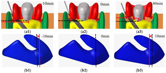 The three-point seat belt restraint path is adjusted by changing the position of the shoulder belt guide and the lap belt guide. More specifically, the shoulder belt guide is adjusted by changing the height of the seat headrest. In the current study, the headrest height of the reference model was set to 0 mm, as shown in Figure 8a2. Since the distance between the child dummy and the shoulder belt guide is relatively small in the reference model, the minimal downward adjustment value of the headrest is set as −10 mm as shown in Figure 8a1. The maximal upward adjustment distance of the headrest is set as 40 mm as shown in Figure 8a3. Regarding the lap belt guide position, the value is set to 0 mm in the reference model as shown in Figure 8b2. The inward movement is defined as negative, and the minimum value is set to −10 mm, as shown in Figure 8b1. The outward movement is defined as positive, and the maximal value is set to 10 mm, as shown in Figure 8b3.