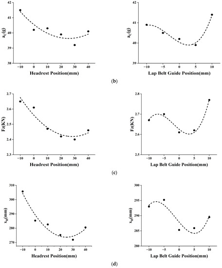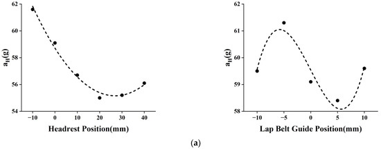 As shown in Figure 9, all four injury indices have similar variation when changing the headrest position or the lap belt guide position. In general, the responses of the four injury indices of the child dummy generally tend to decrease and then increase with the increase in headrest height and lap belt guide position. When the headrest height falls into the range of 20 mm to 30 mm, the values of all injury indices are small, and the minimal values lie within the range. Then the shoulder belt guide is also in a relatively ideal position. When the lap belt guide position falls into the range of 0 mm to 5 mm, the pelvic part of the child dummy is well restrained by the lap belt, and the occurrence of the lap belt slipping down to the thigh or sliding to the abdomen can be effectively avoided.