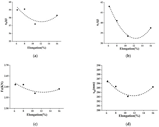 In a crash event, the seat belt deformation directly affects the injury indices of a child dummy, and the webbing stiffness determines the elongation of the seat belt. In this study, the webbing stiffness is characterized by the elongation of the seat belt when the tensile force reaches 10 kN. In the reference model, the seat belt elongation is 8%. To study the effects of webbing stiffness, four different elongation values are specified, that is 8% elongation for the reference model and 16%, 10.6% and 6.2% for the other three models. The corresponding four indices are determined through the frontal collision simulation and their variations are shown in Figure 10. When the elongation is 10.6%, the four injury indices of the child dummy are the smallest.