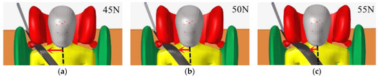 Different initial contact positions between the shoulder belt and the shoulder: the shoulder belt leaning outward relative to the reference model with an initial tension of 45N; (a) the reference model with an initial tension of 50N; (b) the shoulder belt leaning inward relative to the reference model with an initial tension of 55N (c).