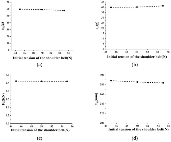 A value of 3 ms head resultant acceleration variation (a); 3 ms chest resultant acceleration variation (b); upper neck tension variation (c); the head horizontal displacement variation (d) caused by the shoulder belt initial tension adjustment.