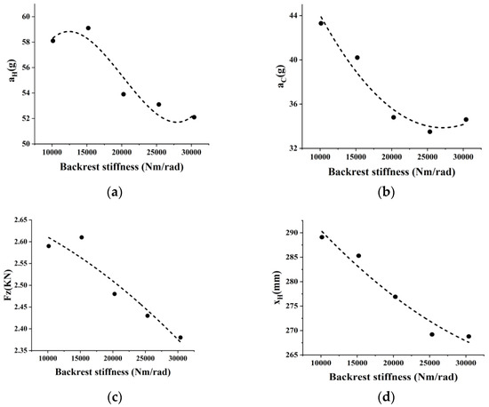 In engineering applications, the backrest stiffness can be adjusted by adding stiffeners or modifying the structure. The stiffness of the seat backrest can be characterized by the torque that causes the seat rotation to reach 0.1 rad. In this study, the backrest stiffness in the reference model is 15,200 Nm/rad. The backrest stiffness is adjusted by varying the shell element thickness in the FEA model. In the current study, the minimal stiffness value is two-thirds of the reference model, and the maximal value is twice the reference model. The other two stiffnesses, 20,267 Nm/rad and 25,333 Nm/rad between the reference and the maximal value are also specified. As shown in Figure 13, the injury indices, , , and initially decreased with the increase in backrest stiffness, and then remained stable in the range of 20,267 Nm/rad to 30,400 Nm/rad. This is because once the backrest stiffness reaches 20,267 Nm/rad, the backrest can provide sufficient stiffness to resist the deformation caused by the three-point seat belt during the crash event.
