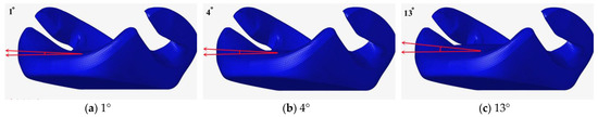 Seat cushion angles: 1° (a); 4° (reference model) (b); 13° (c).