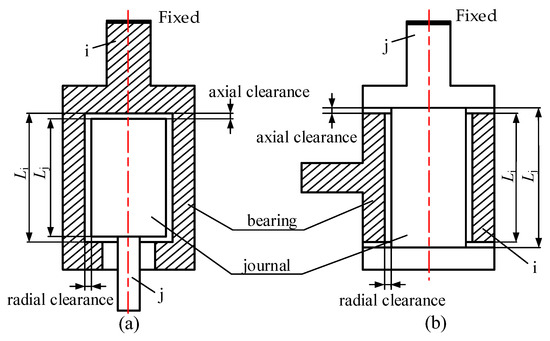 According to the practical application of a revolute joint in the production line, Figure 1 shows two combinations of a revolute joint. In Figure 1a, the bearing is fixed and the journal has axial or radial offset with respect to the bearing. In Figure 1b, the journal is fixed and the bearing has axial or radial offset with respect to the journal. The bearing is regarded as a rigid body i and the journal as a rigid body j.