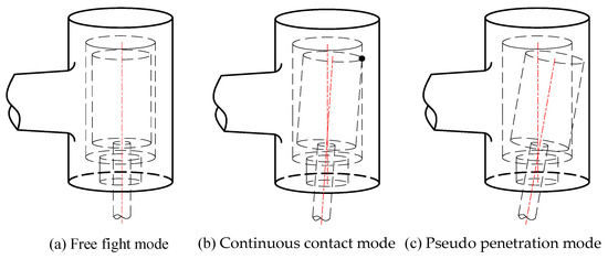 As shown in Figure 3, there are three modes of matching between the revolute joint journal and the bearing during rotation. They are free flight mode, continuous contact mode, and pseudo penetration mode. The first mode refers to the mode in which the journal and bearing do not make contact completely during the rotation, as shown in Figure 3a. The continuous contact mode is the mode in which the bearing and journal make contact, but do not deform during the rotation, as shown in Figure 3b. The pseudo penetration mode refers to the mode wherein the bearing and journal deform to a certain extent as a result of the contact force during the rotation, as shown in Figure 3c.
