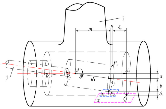m is the projection of the mode of vector d1 on the axis AiBi. n is the projection of journal radius AjPa on the axis AiBi of the bearing. Pa is the most right point of the journal and the closest point to the bearing in the axial direction. The distance between Pa and the inner surface of the bearing is expressed by δa, which is called the minimum distance between the bearing and the journal in the axial direction. Its expression is shown in Equation (5):