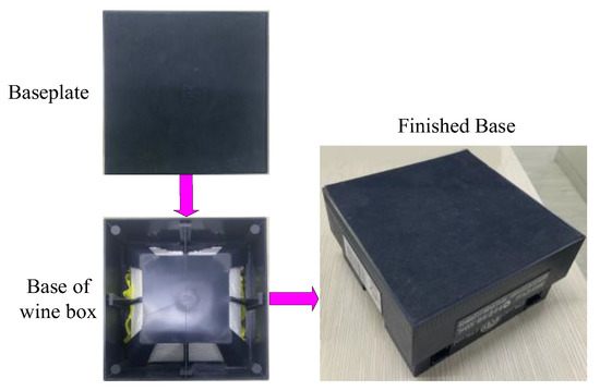 As shown in Figure 6, a SCARA assembly robot with four DOFs is installed in the wine box production line to assemble the base of the wine box. The robot sucks up the bottom sticker of the pedestal through the suction cup at the end and then accurately places the bottom sticker on the base model with glue through a certain trajectory. After the glue solidifies, the assembly of a finished base is complete.