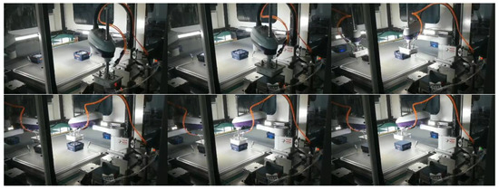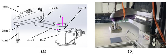 Figure 7a shows that the robot base is bolted to the production line; arm 1 is connected to the base through joint A, arm 2 is connected to arm 1 through joint B, and the end of arm 2 is connected to arm 3 through joint C. Joint A and joint B belong to the revolute pair and joint C belongs to the cylindrical pair. The frame O−XYZ is constructed at joint A on arm 2. O is the center of the upper cylindrical surface where joint A and arm 2 make contact. The Z axis is the rotation axis of joint A; the direction is upward. The X axis coincides with the line of joint A and joint B, and the Y axis is established through the right hand rule. When joint A, joint B, and joint C do not have joint clearance, the multi-body system has only one topology; otherwise, the multi-body system will have a variable topology. As shown in Figure 7b, the SCARA robot grasps the bottom sticker of the wine box through the suction cup on the end effector. Figure 8 shows the specific action process of the SCARA robot.