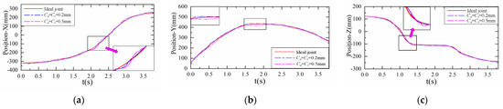 When there are clearances of different sizes in joint B, the movement trajectory of the end effector of the SCARA robot will change to different degrees. Figure 9a–c show the displacement change curves of the geometric center of the end effector along the X, Y, and Z axes, respectively, in the O−XYZ coordinate system during the completion of an operation cycle of the robot. In Figure 9, the motion trajectory of joint B with no clearance is shown by the red curve, the motion trajectory of joint B with clearance Ca = Cr = 0.2 mm is shown by the blue curve, and the motion trajectory of joint B with clearance Ca = Cr = 0.5 mm is shown by the magenta curve. As can be seen in Figure 9, when joint clearance is present, the displacement trajectory will fluctuate slightly. The displacement trajectory when joint clearance is 0.2 mm has smaller fluctuation than that when joint clearance is 0.5 mm.