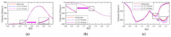 Figure 10a–c show the velocity variation curves of the geometric center of the end effector of the SCARA robot along the X, Y, and Z axes, respectively, in the frame O−XYZ. Through comparison, it can be found that the joint clearance of different sizes has different influences on the velocity, and the joint clearance of 0.5 mm has a greater influence on the velocity.