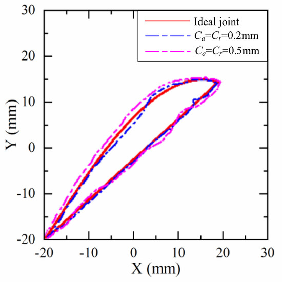 Figure 12 shows the path of the journal center running in the bearing under different clearances during the operation of the SCARA robot. In Figure 12, the solid line in red represents the path of the center of the journal in an ideal joint. The blue dotted line inside the circular track composed of red solid lines indicates that the contact mode at this time belongs to the first contact mode, and there is no contact force between them. The part where the blue dotted line coincides with the red solid line represents that the current state is a continuous contact mode, and the blue dotted line belongs to a pseudo penetration mode outside the circular track. These two states can generate different contact forces between them.