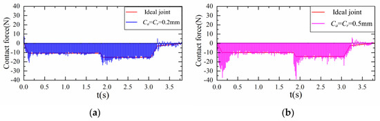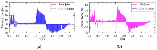 Figure 13, Figure 14 and Figure 15 show the variation trend of the bearings and journal of joint B in the X and Y directions, respectively. Figure 13 shows the change in the contact force of joint B in the X direction. By observing the ordinate of Figure 13a,b, it can be found that, when the time t is near 1.6 s and 2.5 s and the clearance is 0.5 mm, the amplitude and fluctuation of the contact force between the bearing and journal are larger. Figure 14 shows the change in the contact force of joint B in the Y direction. By observing the ordinate of Figure 14a,b, it can be found that, when the time t is near 0.2 s and 1.8 s and the clearance is 0.5 mm, the amplitude and fluctuation of the contact force between the bearing and journal are larger. Figure 15 shows the change in the contact force of joint B in the Z direction. By observing the ordinate of Figure 15a,b, it can be found that, when the time t is near 2.1 s and 2.5 s and the clearance is 0.5 mm, the amplitude and fluctuation of the contact force between the bearing and journal are larger.