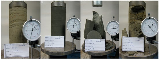 Figure 2 illustrates several limestone images in the laboratory during the UCS test, which was used for preparing the SVM primary dataset. According to the ASTM [7] instructions, providing a proper sample is one of the key steps in UCS testing, as this leads to a reduction in measurement errors. UCS tests are typically performed on intact rocks with standard lengths of 100 mm (prepared) or with NQ, HQ, or PQ diamond drill cores, and the maximum axial loading is recorded at the failure point [1]. The correct preparation of samples leads to the obtaining of more reliable UCS values and classified accuracy of a rocks’ strength. The International Society for Rock Mechanics (ISRM) standard classification for UCS variation in rock is very low (<5 MPa), low (5–25 MPa), moderate (25–50 MPa), medium (50–100 MPa), high (100–250 MPa), and very high (250< MPa) [32]. Sedimentary rock is generally classified as being in the very low to medium classes [11]. Nevertheless, the UCS corresponds to axial loading, where peak stress is responsible for the failure of a rock sample. Using displacement transducers and strain gages, the stress–strain data were continuously logged and recorded.