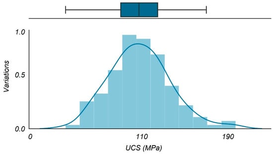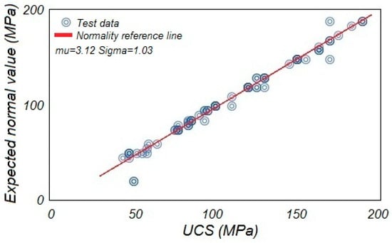 After the testing stage, according to the standard procedure, all the UCS values were measured and categorized. Statistical analysis is one of the most important stages for providing appropriate ground data. Although various indexes for multi-indicator analysis for geomaterials [41,42,43] exist, in SVM modeling, the predictive analysis is usually based on two directions and two variables. Therefore, underrating the target values is much more important. The main uncertainty [44] regarding the model in this study belonged to the UCS values, which could be modified by considering the distribution function and normalized by the Q–Q chart, as presented in Figure 3 and Figure 4. Table 2 provides the statistical variations in the estimated UCS values for the Maragheh limestone. The quantile–quantile chart (known as the Q–Q chart) was obtained for the UCS results to examine the normality of the data variations, as illustrated in Figure 3. Based on the results of the statistical analysis of the UCS data, it was indicated that the average UCS value measured for the studied limestone was 109.93 MPa, and the calculated standard deviation was 39.754. Regarding the Q–Q chart, the experimental data followed a normal distribution law within the confidence interval of 93.7%. This fact was verified using a normal distribution envelope on the UCS data, as shown in Figure 4.