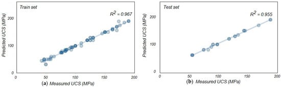 Correlation between the actual and predicted UCS results: (a) training set, (b) testing set.