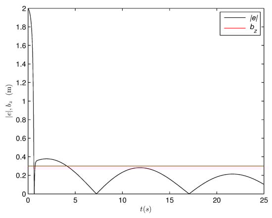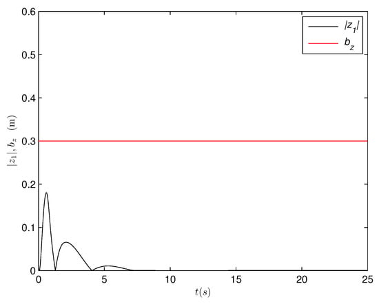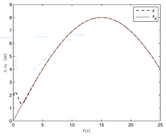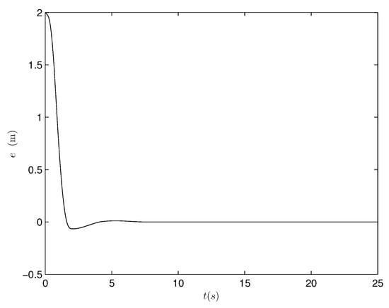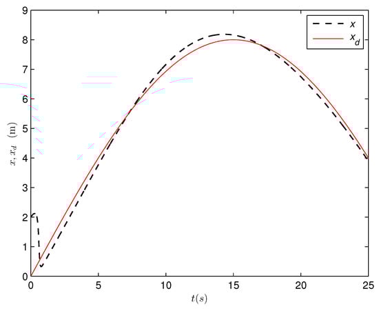 The REMUS UAV model is used to verify the performance of the controller, and the simulation parameters are selected according to [] as follows: , , , . is set as . The reference trajectory is set as . The initial state is m and m/s.