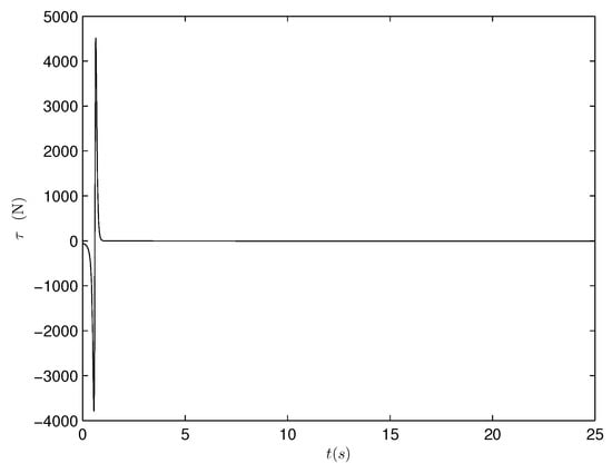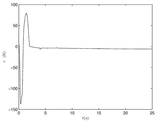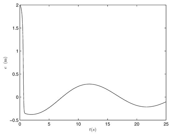 The output feedback barrier adaptive control scheme (48)–(50) is adopted for simulation, with the parameters and gains in the proposed adaptive control scheme (48)–(50) set as follows: , , . The simulation results are shown in Figure 2, Figure 3, Figure 4 and Figure 5. Figure 2 shows the tracking curve of surge displacement, with the corresponding tracking error plotted in Figure 3. From Figure 2 and Figure 3, we can see that a favorable tracking performance was obtained. From Figure 4, we can see that is constrained within . Figure 5 shows the profile of the control input.